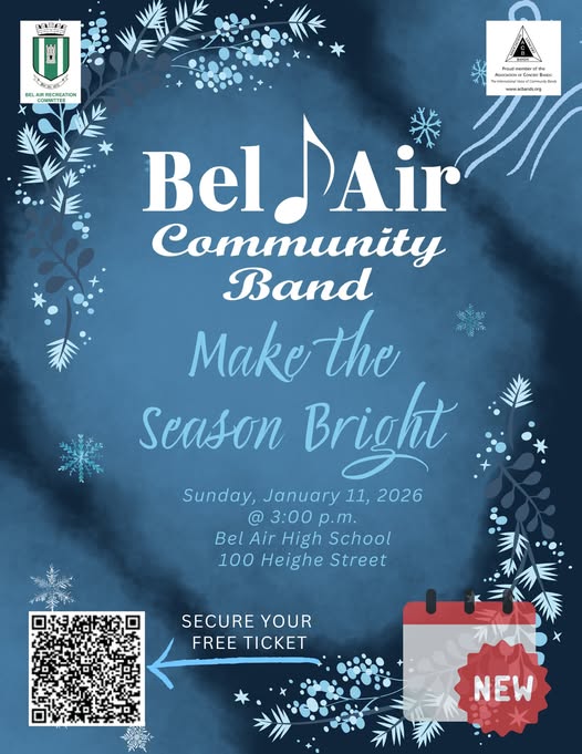 Enjoy a beautiful selection of seasonal and holiday music for all ages. Many styles and popular music will be featured to get you in the spirit of the holidays! Admission is free, but reservations are required. Visit www.belaircommunityband.org.