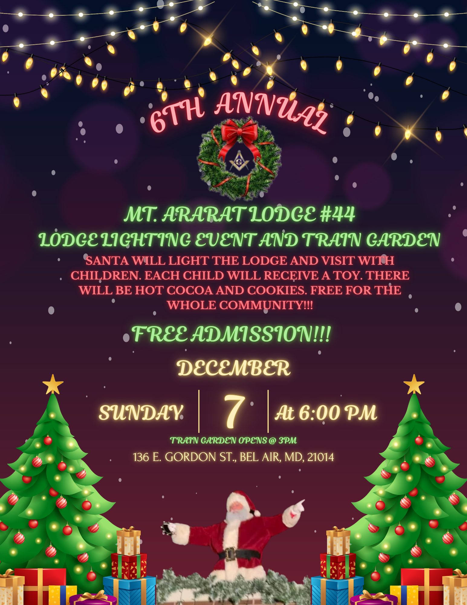 December 7 @ 3-9pm – Mt. Ararat Lodge will hold an official holiday lodge lighting at 6 pm. Following the lighting, Santa will be available in the lodge room, where children can sit with Santa and have pictures taken with him. Each child can also choose a FREE toy. This event is open to the public and free to attend. At the Christmas Train Garden, cookies, popcorn, & hot chocolate will be served.