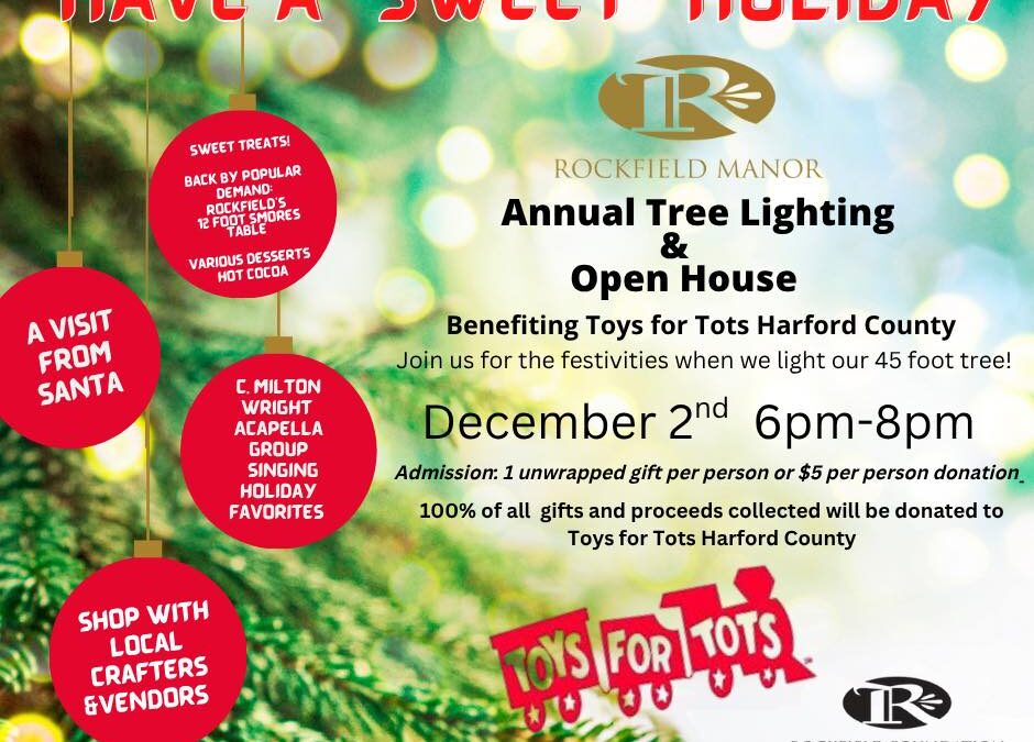 Join Rockfield Manor to kick off the holiday season with the lighting of their 45-foot tree. 100 percent of gifts & proceeds collected will be donated to Toys for Tots of Harford County!